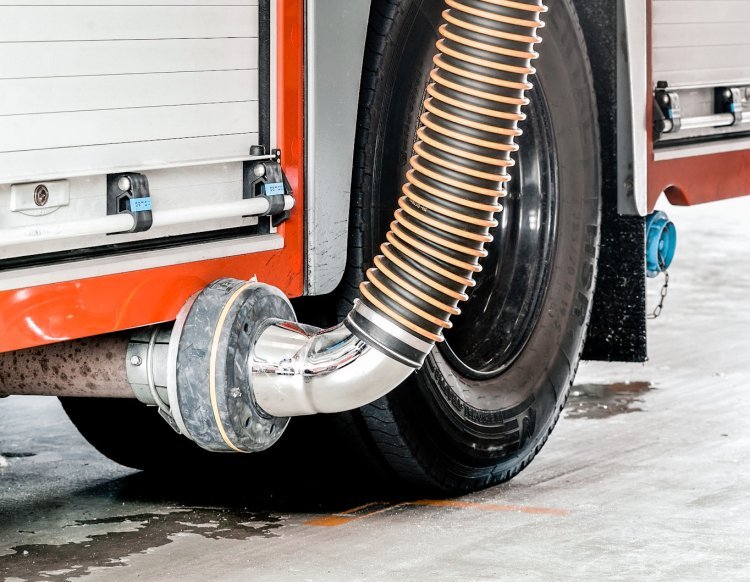 1. Pakokaasurata liitetään paloautoon heti, kun pakoputki yltää poistosuulakkeeseen, jopa ennen kun koko auto on ajanut kokonaan halliin. Puhallin käynnistyy ja pakokaasut johdetaan turvallisesti katolta ulkoilmaan.