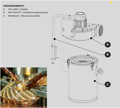 MistWizard MW-2 asennetaan suoraan työstökoneeseen, jolloin ei tarvita ylimääräisiä putkistoja eikä se vie lattiatilaa. Suodatin kerää tehokkaasti jäähdyttävää leikkuunestettä ja savua laitteen prosessista ja palauttaa jäähdytysöljyn takaisin työstötilaan.