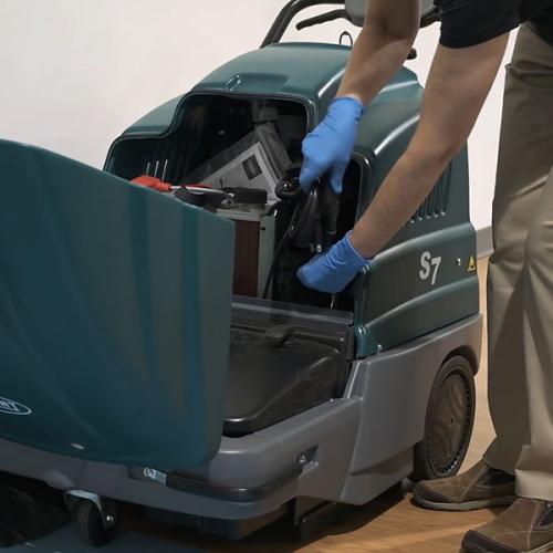 Akkukäyttöinen S7 lakaisukone soveltuu isoihin sisä- ja ulkokohteisiin.