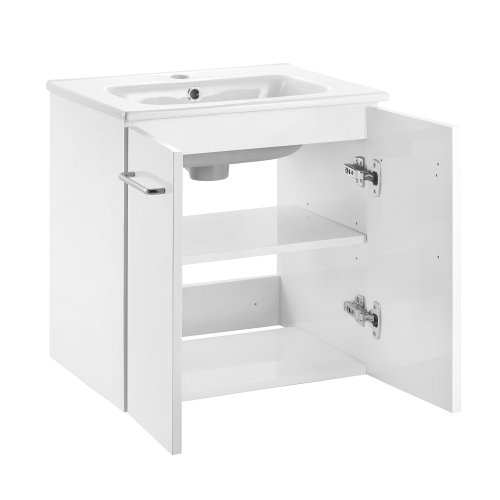 Olemme jättäneet pohjalevyyn 60 mm raon, jotta putket olisi helppo tuoda paikalleen. Lisäksi kaapin ovissa on käytetty hidastesaranoita, joiden ansiosta ovet sulkeutuvat mukavan pehmeästi. Kaapin sisältä löydät hyllyn, jonka voit halutessasi siirtää haluamallesi korkeudelle.
