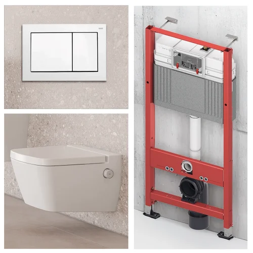 TH LUX 1 WC-pakettikokonaisuus sisältää TECEbase Nordic asennustelineen, TECEone bidé seinäWC-istuimen sekä valkoisen TECEbase 9240700 huuhtelupainikkeen.