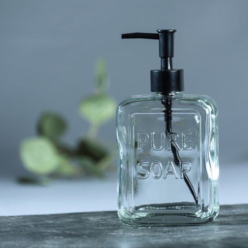 Pure soap on aidosta lasista valmistettu saippua-annostelija, jonka kyljessä lukee "PURE SOAP" kohokuvioiduin kirjaimin. Pumppuosa on musta. Makuasiat ovat makuasioita, mutta tästä ei paljoa saippua-annostelija voi tyylikkäämmäksi muuttua.