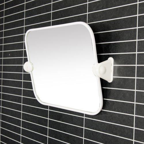 Säädettävää seinäpeiliä voit kallistaa haluamaasi kulmaan tarpeen mukaan. Peilissä on valkoinen muovikehys.