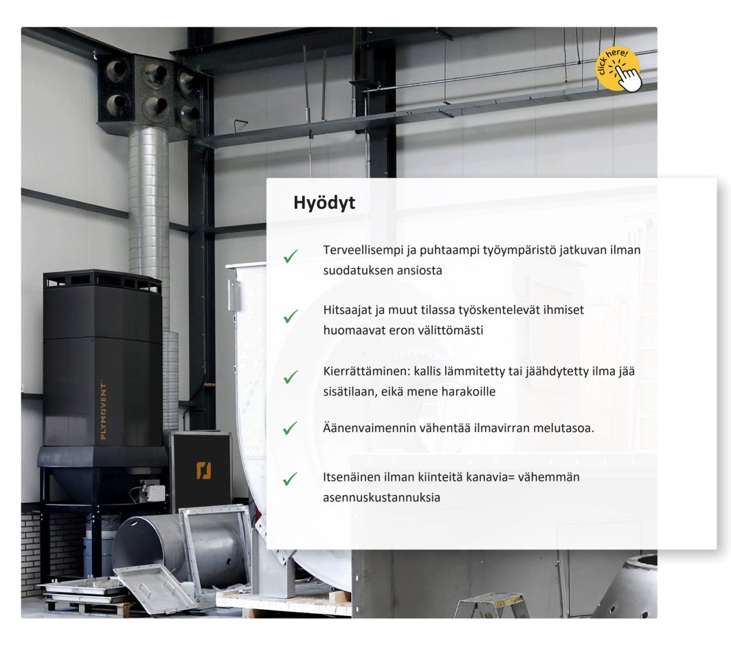 PushPull on itsenäinen yleinen suodatusjärjestelmä, joka on kehitetty vähentämään ja hallitsemaan hitsauskaasujen taustapitoisuutta tuotantotiloissa. Jos työkappaleet ovat liian suuria imuvarsilla katettaviksi tai jos hitsaaja liikkuu koko ajan eri kohteiden välillä, kohdepoisto ei ehkä ole mahdollinen.