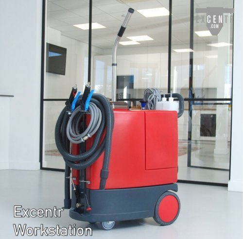 Excentr työasema sisältää kaikki tärkeimmät komponentit märkä-tilojen, myymälöiden ja liikuntapaikkojen desinfiointiin sekä pesuun. Laitteessa on kaksi eri säiliötä ja annostelua pesuaineelle sekä desinfiointiaineelle, vesi-imuri sekä puhtaan veden ruiskutus.