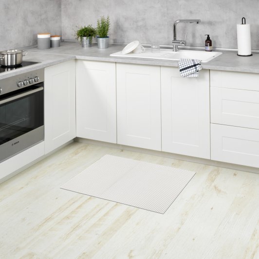 Matto on täysin vedenkestävä, hygieeninen ja likaa hylkivä. Voit sijoittaa valkoisen maton huolettomasti kotisi kuiviin tai märkiin tiloihin, myös lattialämmitteisille lattioille. Pehmeä ja liukumaton matto tuntuu sekä kivalta jalkojesi alla, että tuo myös turvallisuutta märkiin tiloihin. Jos haluat tehdä matosta hieman pienemmän, voit leikata sitä tavallisilla keittiösaksilla. Puhdistus hoituu varovaisella konepesulla 40° C:ssa.