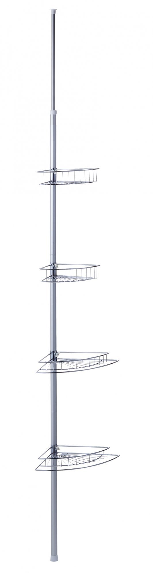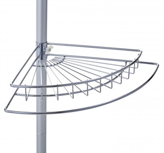 Suihkukulmahylly pingotetaan katon ja lattian väliin, porausta ei tarvita. Neljä koria tarjoavat runsaasti säilytystilaa tarpeellisille pesuaineille ja -välineille.
