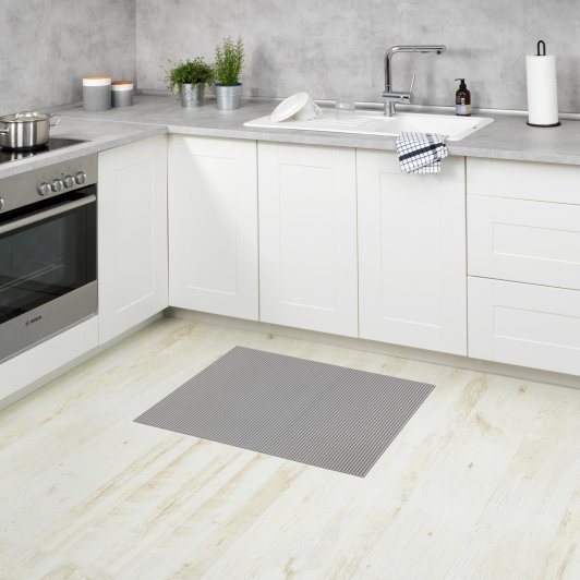 Matto on täysin vedenkestävä, hygieeninen ja likaa hylkivä. Voit sijoittaa harmaan maton huolettomasti kotisi kuiviin tai märkiin tiloihin, myös lattialämmitteisille lattioille. Pehmeä ja liukumaton matto tuntuu sekä kivalta jalkojesi alla, että tuo myös turvallisuutta märkiin tiloihin. Jos haluat tehdä matosta hieman pienemmän, voit leikata sitä tavallisilla keittiösaksilla. Puhdistus hoituu varovaisella konepesulla 40° C:ssa.